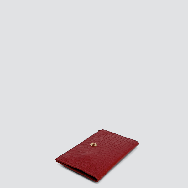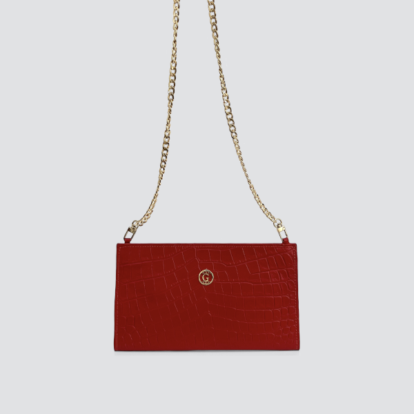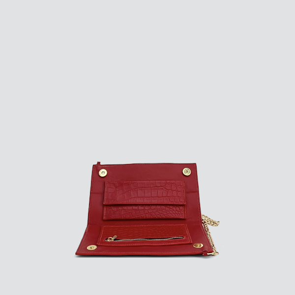 Super sleek and light weight ultra slim croc embossed red clutch. Decorated with mini gold-tone logo metal hardware on front and calf leather interior lining with two pockets, including one zipper pocket and snap closure on the sides. The extremely functional flat design is perfect for fitting in your favourite clutch or crossbody with its detachable chain strap.